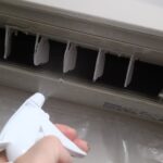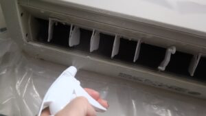 希釈した洗浄剤をエアコン前面のフィンや吹き出し口に霧吹きで吹き付けて10分放置。