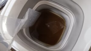 すると、ビニールの排水口を伝ってバケツにカビやほこりの黒い水が流れ込みました。